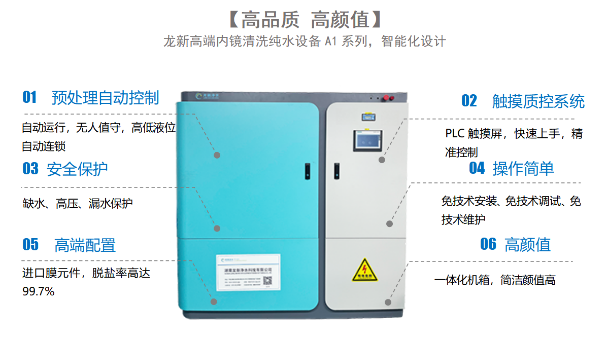 內(nèi)鏡清洗純水設(shè)備A1系列原水水質(zhì)是市政自來(lái)水、水質(zhì)指標(biāo)符合GB/5749生活飲用水衛(wèi)生標(biāo)準(zhǔn);產(chǎn)水電導(dǎo)率<15us/cm,水質(zhì)符合《軟式內(nèi)鏡清洗消毒技術(shù)規(guī)范》WS507-2016用水指標(biāo)軟式內(nèi)鏡清洗消毒細(xì)菌總數(shù)≤ 10 CFU/100 mL,濾膜孔徑(定期更換)≤ 0.2 μm。