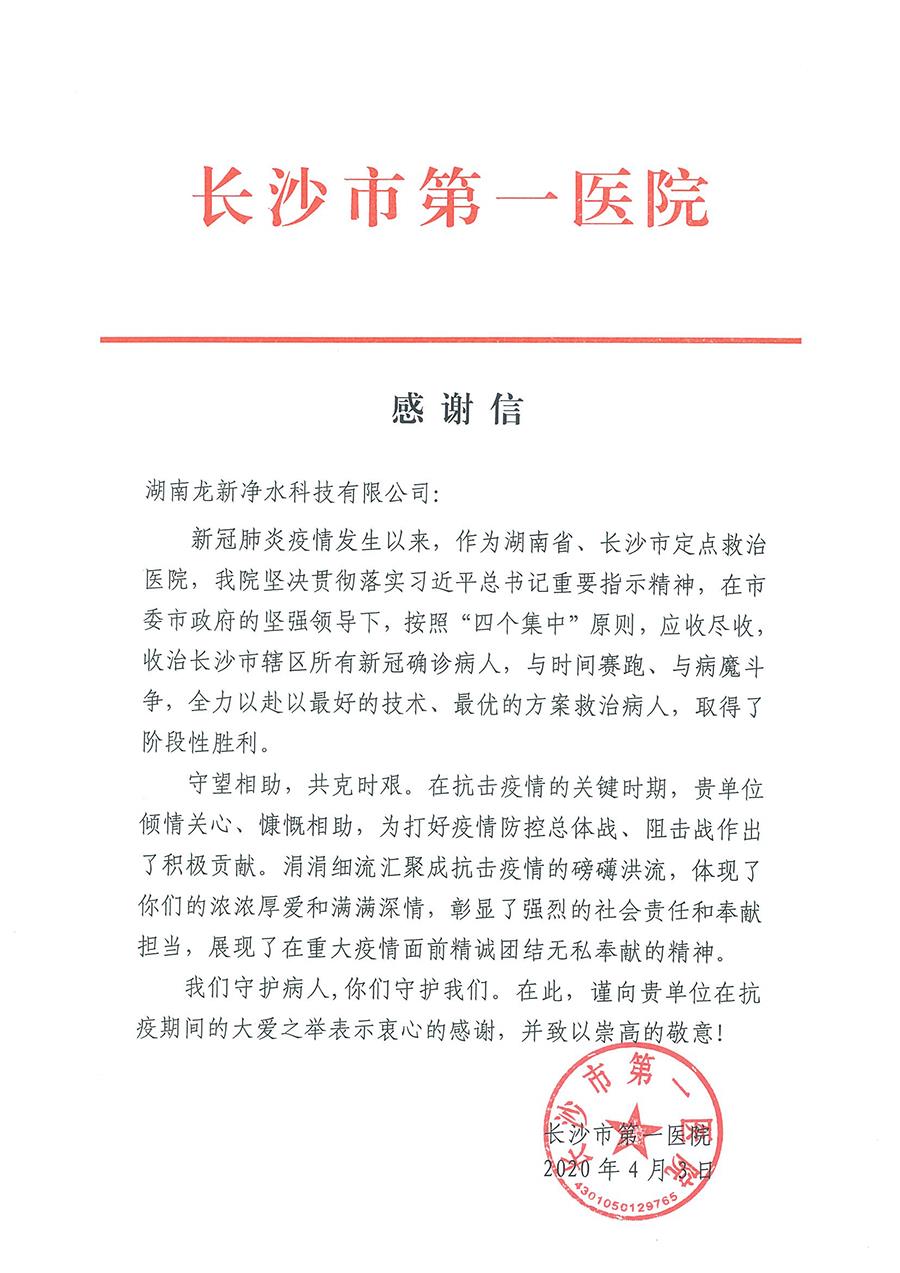 關于龍新疫情期間,龍新凈水科技作為醫(yī)院中央純水系統(tǒng)解決方案公司,充分發(fā)揮專業(yè)優(yōu)勢,勇?lián)鐣熑?,同安吉爾公司合力向長沙市第一醫(yī)院捐贈一批水設備用來解決全院飲水問題。以實際行動詮釋了同舟共濟、共克時艱的社會責任和擔當。