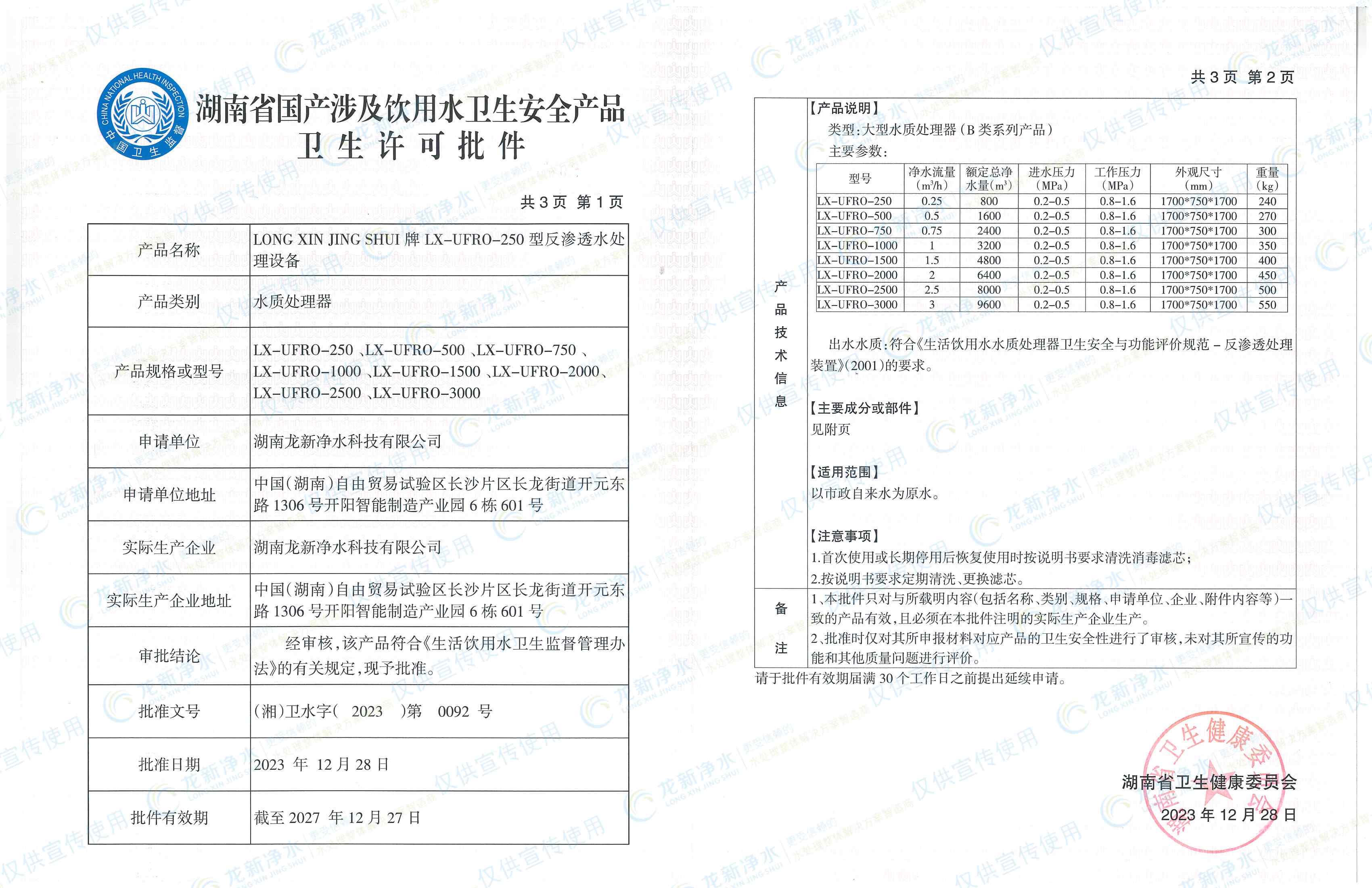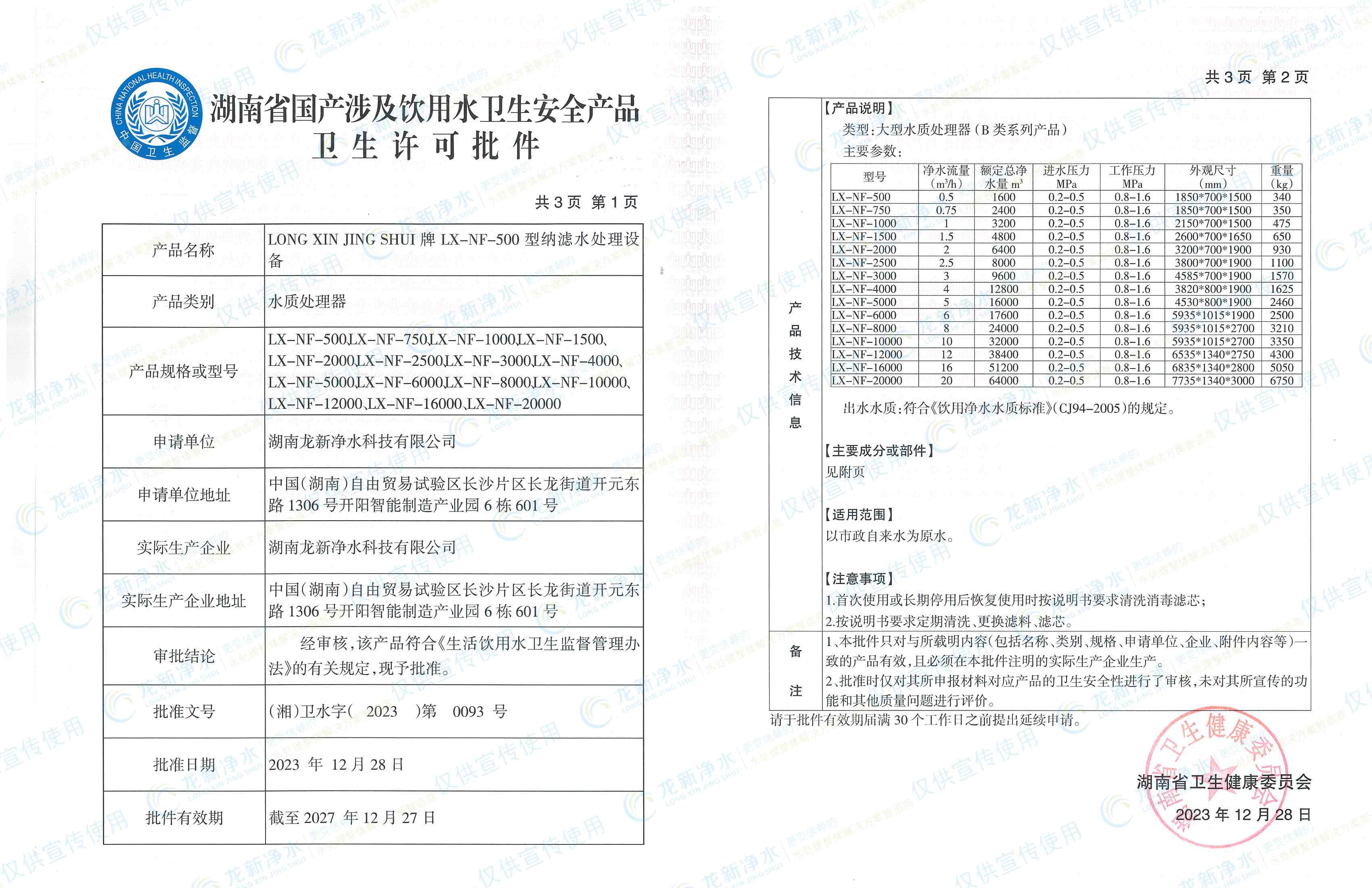 涉水衛(wèi)生安全產(chǎn)品衛(wèi)生許可批件
